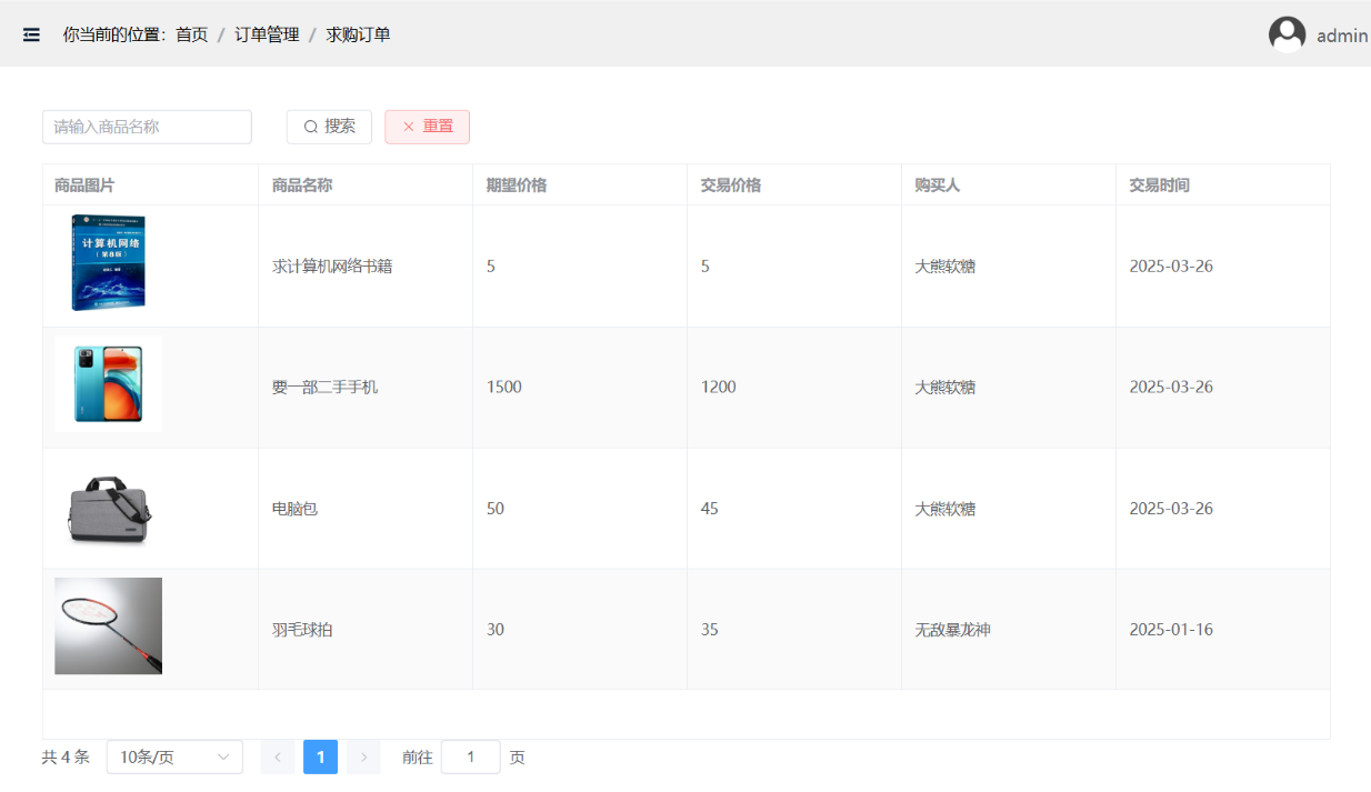 With the continuous expansion of university enrollment, the vast quantities of study materials and everyday items generated by students have become a vital resource for the campus second-hand market. However, traditional offline trading methods often suffer from poor information flow and inadequate transaction security. To address this problem, this thesis presents the design and implementation of a campus second-hand goods trading system. The system utilizes the uni-app framework to develop a mobile mini-program, with a backend built on Spring Boot that provides RESTful APIs, using IntelliJ IDEA as the development tool and MySQL as the database. The platform is divided into two main modules: a mobile client and a backend management module. The mobile client offers features such as user login and registration, product browsing, posting of buying and selling requests, online communication, product detail viewing, reporting, and personal profile management; while the backend module enables unified management of users, products, menus, and reports. Featuring a clean and visually appealing interface with simple operation and robust scalability, the system effectively meets the second-hand trading needs of students. By digitizing the trading process, it reduces transaction costs, enhances resource utilization, and promotes environmental protection and conservation awareness—thereby offering significant social value and strong potential for broader application.