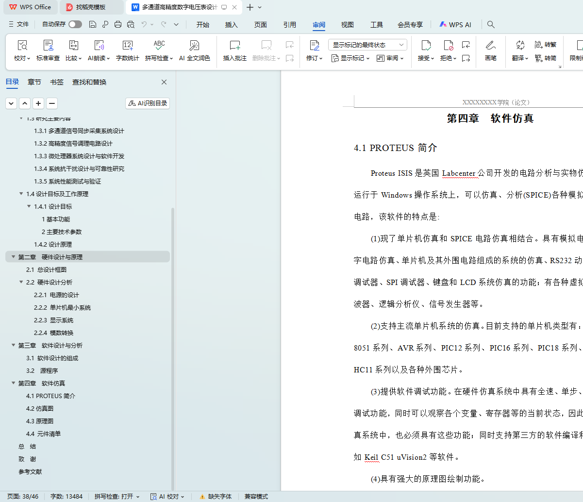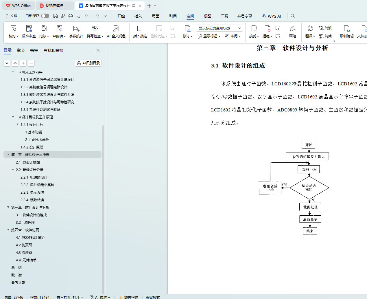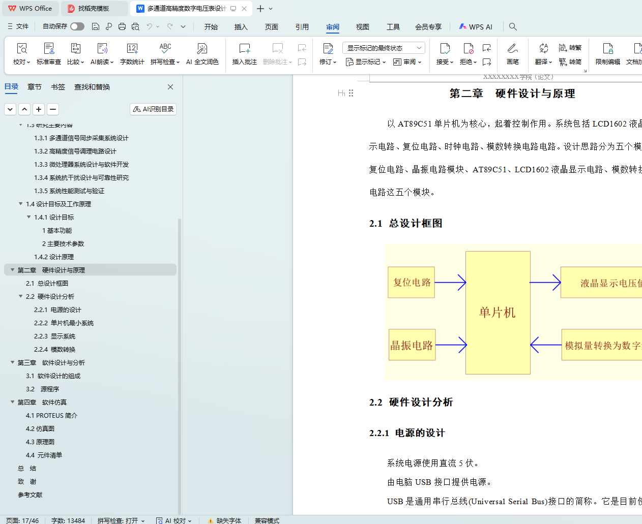 本文聚焦于多通道高精度数字电压表的设计。首先调研了国内外多通道高精度数字电压表的研究现状、核心技术及应用场景,明确设计的技术指标与创新方向。系统以 AT89C51 单片机为核心,构建总体方案,涵盖信号采集、放大滤波、A/D 转换、多通道切换以及数据处理与显示等模块。硬件设计方面,完成高精度 ADC 芯片选型,选用 ADC0809 作为模数转换芯片,精心设计信号调理电路与多通道切换逻辑电路,绘制完整的系统硬件原理图及 PCB 版图,确保电路布局合理、抗干扰性能良好,实现至少 8 路 0 - 10V 模拟电压信号采集,精度优于 0.01%。软件上,开发基于单片机的控制程序,实现多通道自动切换周期可设(10ms - 1s),数据刷新频率不低于 10Hz。该数字电压表测量电压范围为 0 - 5V,利用 ADC0809 将模拟量转换为数字量输入单片机 P0 口,再由单片机控制 LCD1602 液晶显示电压值。经测试,系统能稳定运行,满足设计要求,为多通道电压测量提供了一种可靠方案。