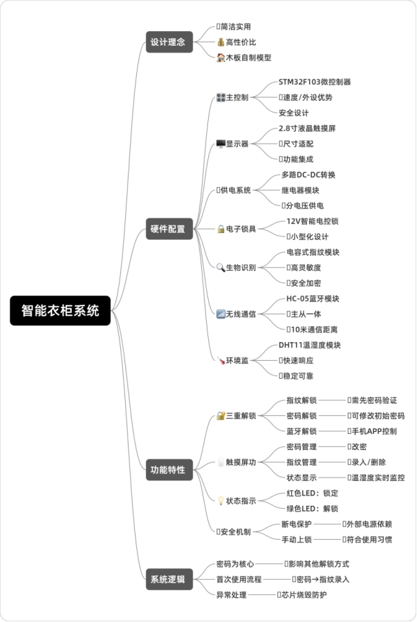 本系统围绕简洁、实用、高性价比设计。考虑成本与呈现效果,选用木板自制小型智能衣柜模型。控制器选 STM32F103 微控制器,其速度、外设及可操作性优于 51 单片机,能满足系统需求且性价比高。显示器件选高清 2.8 寸液晶触摸屏,契合模型大小,避免资源浪费。供电采用多路 DC-DC 电压转换模块搭配 1 路继电器模块,可满足各模块不同电压需求,操作简单、性价比高。电子锁匙结构选工作电压 12V 的智能电控箱柜锁,尺寸小、功能全,虽价格较高但契合系统。指纹识别模块选电容式,灵敏度高、安全性强。蓝牙控制模块选 HC-05 主从机一体 BLE 蓝牙模块,通信距离大、速率快、性价比高。温湿度模块选 DHT11,可靠性高、稳定性长、响应快、价格低,且接线方便、操作易懂。