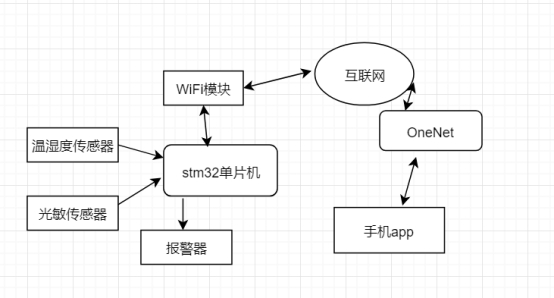 本智能盆栽管家系统围绕提升盆栽养护质量与便捷性展开,涵盖硬件与软件两大核心部分。硬件方面,以 STM32 单片机为控制中枢,搭配土壤湿度、空气温湿度传感器,实时精准采集盆栽生长环境数据。利用 WiFi 模块实现与云平台的数据交互,借助 OLED 显示屏本地展示关键参数。通过继电器控制水泵,达成智能灌溉功能。软件部分,在 STM32 上开发嵌入式程序,负责数据处理与控制指令执行;开发安卓手机 APP,方便用户远程查看数据与下发指令;搭建云平台,用于数据存储、管理与推送。完成系统搭建后,进行全面调试与测试,涵盖硬件功能、软件性能以及整体稳定性等方面,确保系统能准确、稳定运行,满足用户对盆栽智能化养护的需求。系统框架如图1所示: