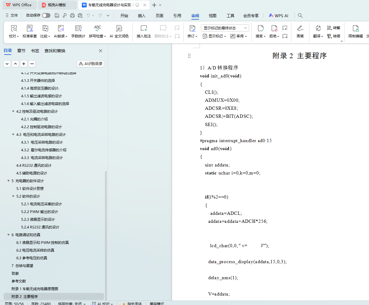 本次车载无线充电器的另一设计的关键是软件控制算法的编写。本次设计选用的是AVR单片机ATmega16,通过编程可以实现电压电流的A/D转换,电压电流和容量的显示和传输,利用PWM对恒流恒压和涓流的控制。