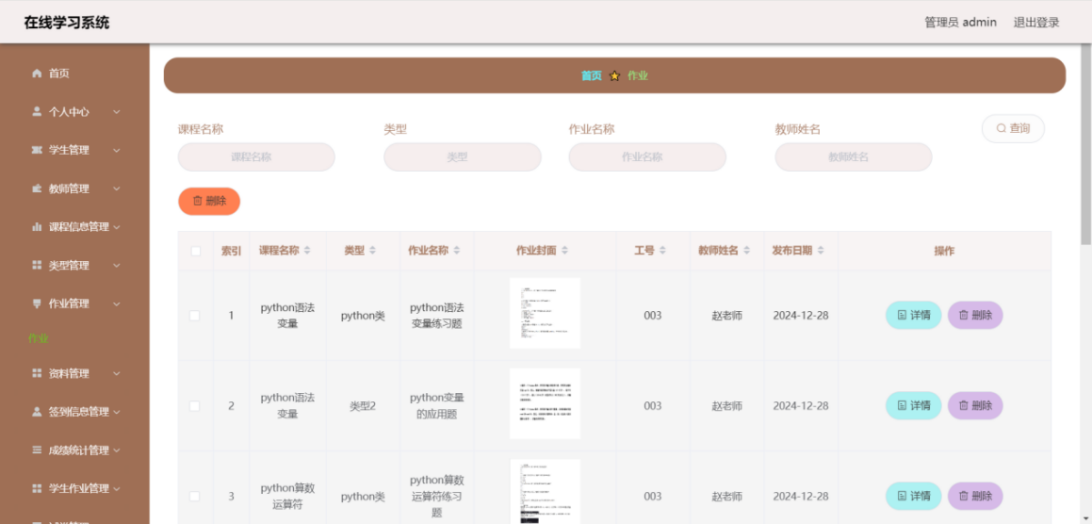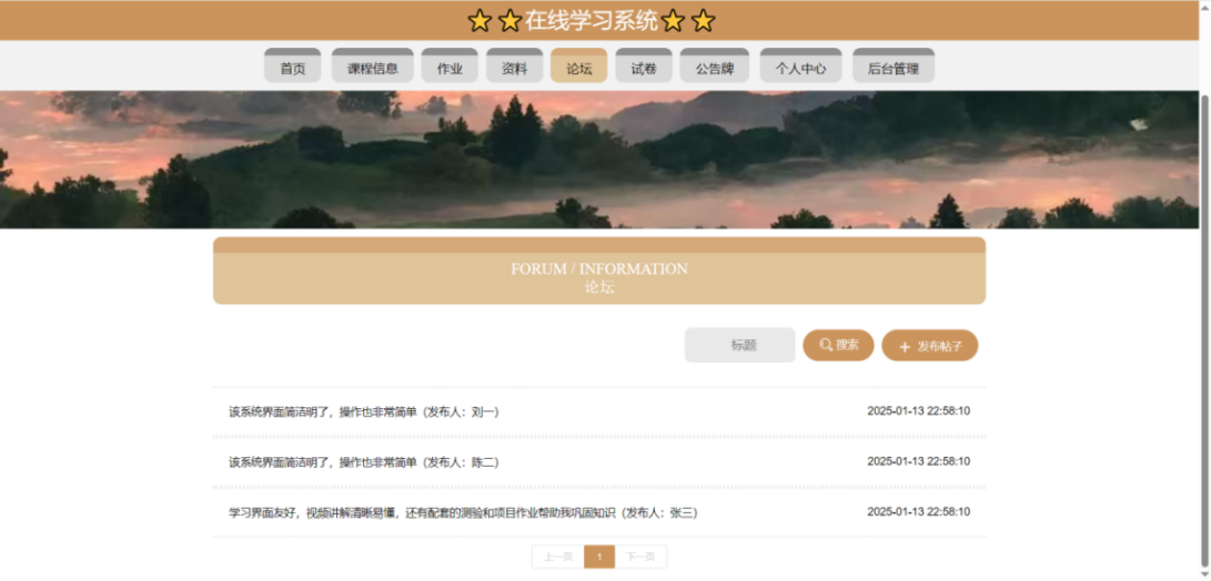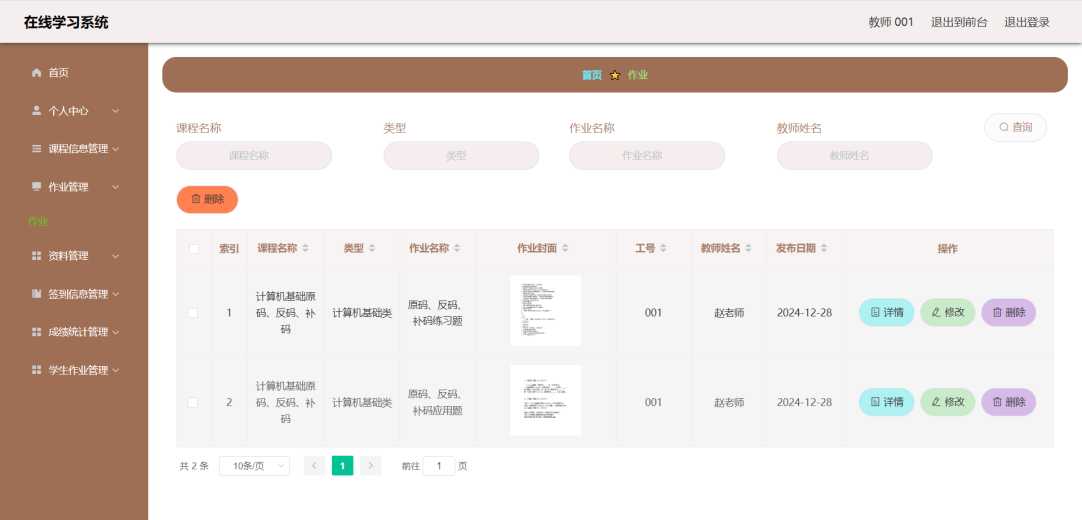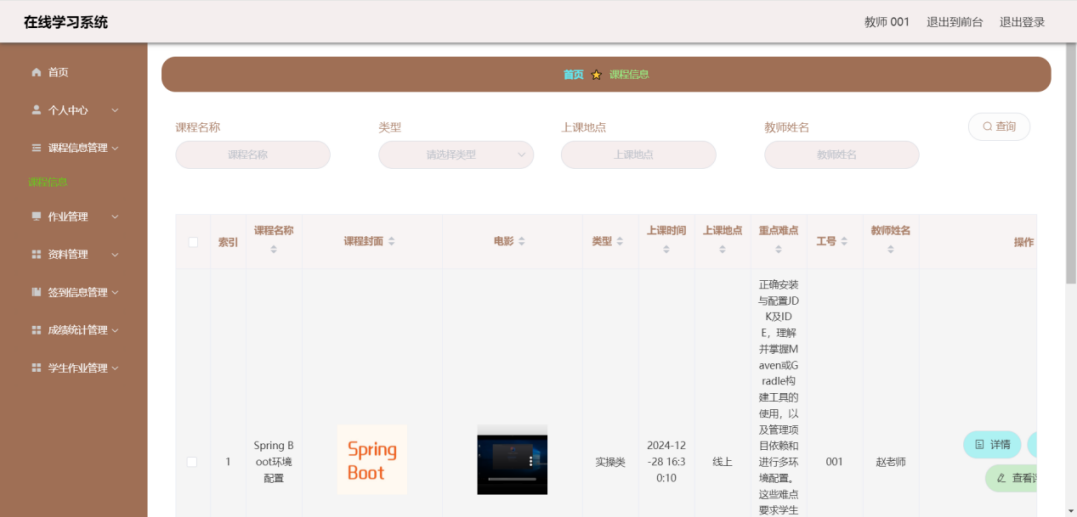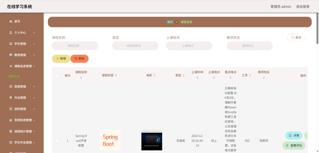 This article uses the SpringBoot framework as the core technology architecture, combined with MySQL database, to build a fully functional and compliant online learning system. The system implements core functional modules such as user registration and login, course selection and learning, homework submission and management, and grade analysis and statistics. Users include three roles: students, teachers, and administrators. Students can browse courses, select courses, post and view comments, modify personal information, etc. through the system; Teachers can post assignments, check student progress, participate in discussions, etc; Administrators are responsible for backend management work, such as user management, course video review, publishing, etc.